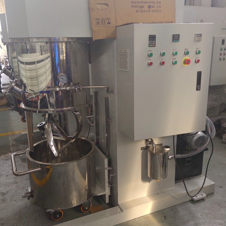 高速分散行星攪拌機(jī)的料桶需用設(shè)備自帶的夾套通水對桶內(nèi)物料加熱,并可在后期采用循環(huán)冷水對料桶內(nèi)物料冷卻。在攪拌過程中,電池漿料中會產(chǎn)生大量的氣泡,此時,必須采用抽真空的方式,去除物料內(nèi)的氣泡。別外,在通過高速分散行星攪拌機(jī)的加料口加粉料過程中會產(chǎn)生粉塵,此時,可安裝通風(fēng)除塵設(shè)備,將氣體排放到安全的地方。