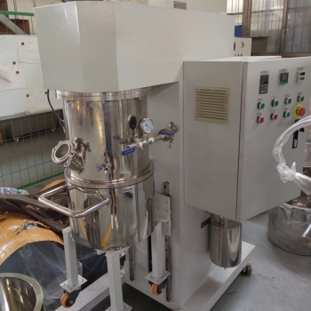 現(xiàn)階段常用的行星攪拌機(jī)通常有兩個(gè)低速檔大行星攪拌槳(通常為多斜漿葉式,大麻花式,框式),一個(gè)或2個(gè)快速大行星攪拌槳(分散化盤)和刮壁槳構(gòu)成。